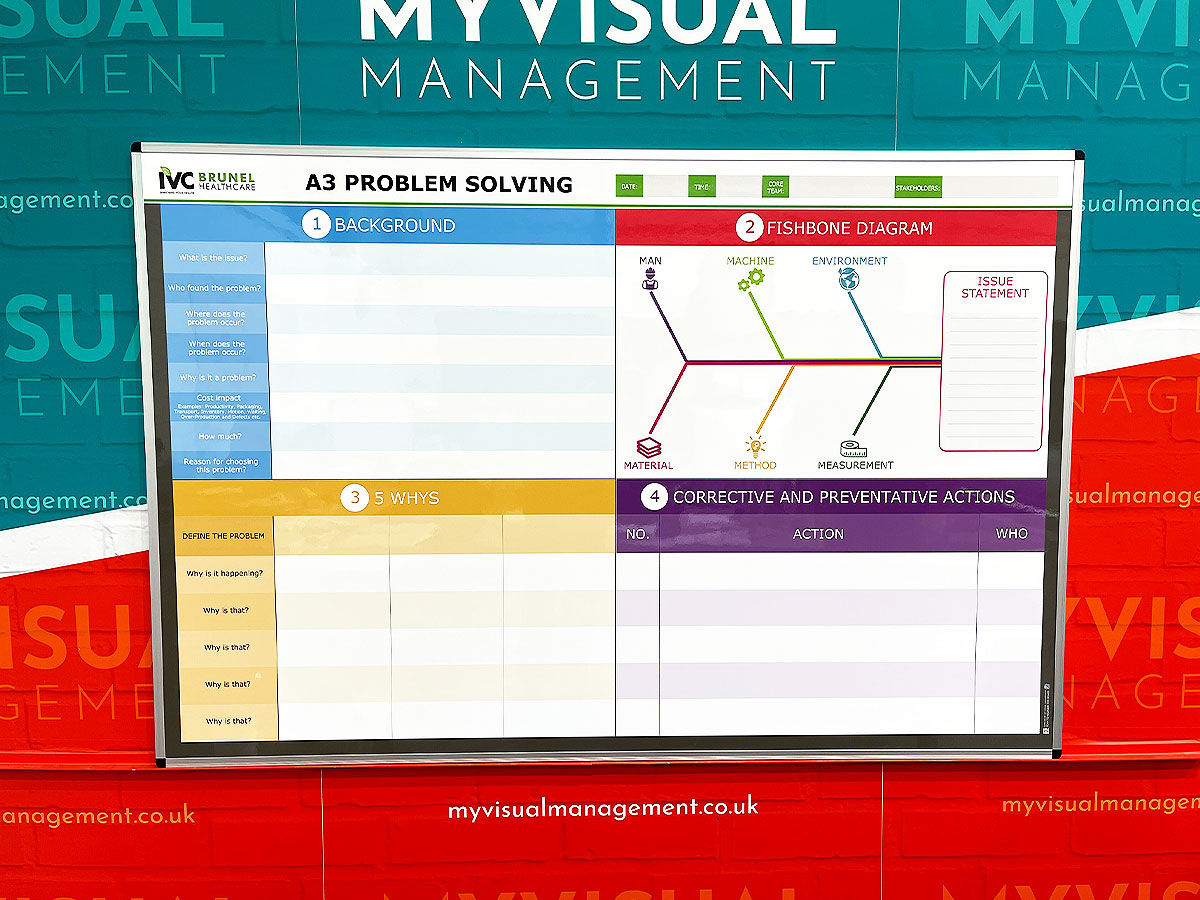 So, show your version of an Ishikawa diagram on your 5M Visual Management Board. For instance, like the examples shown here. Above all, use your board to analyse the problem visually. In other words, use a visual inspection process.