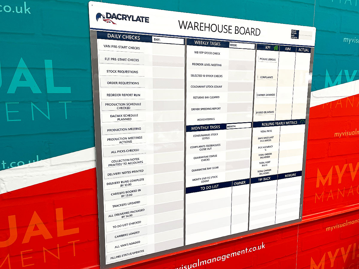 So, make your own board to visually assess how well warehouse processes are operating. Furthermore, with instant status indicators. For example, RAG (red, amber, green) status dials. Alternatively, with magnetic labels. Above all, this type of board is an essential visual management tool because it makes a process visible. Likewise, accessible to all. Therefore, make your process quick to evaluate. As a result, make most informed decisions to make progress.