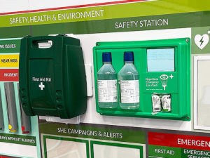 Green is universally linked with first aid and emergency care. First aid boxes, eyewash stations, and defibrillators use green so that people can find them quickly. Clear, well-positioned signage ensures staff know exactly where to go for help. By maintaining visible and well-managed first aid points, organisations create a proactive culture of care and safety.