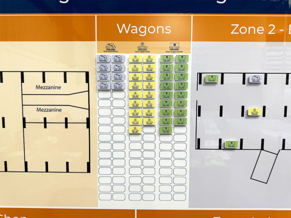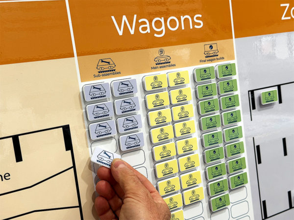 These custom wagon magnet counters help visualise workload and maintain balance across the production process.