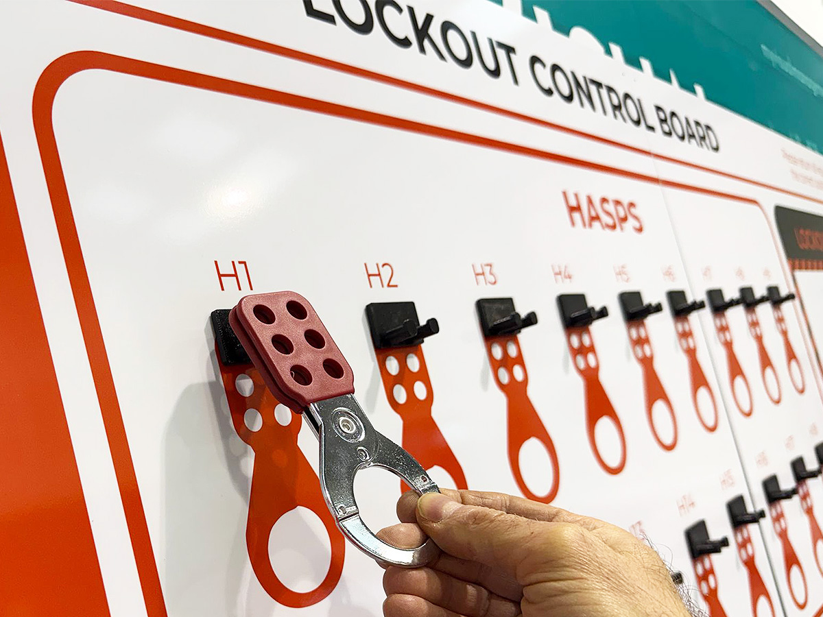 A second lockout control board focused on hasp management, using clearly labelled hooks to ensure hasps were: