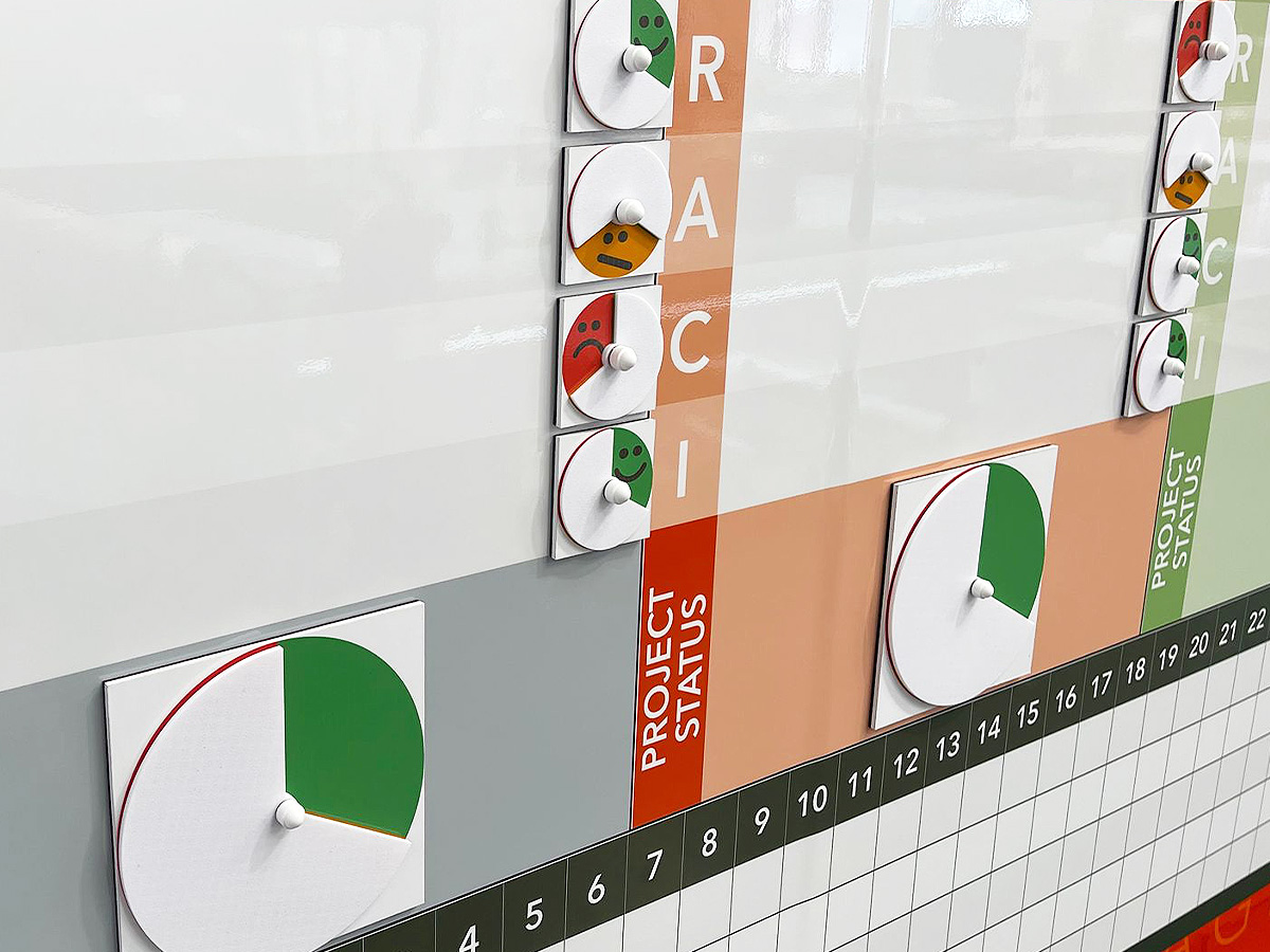 Custom make your own mobile whiteboard. In other words, a Project Management whiteboard set in a frame and, likewise, on wheels. Furthermore, print what you want on it. Therefore, this freestanding visual tool gives ultimate flexibility.