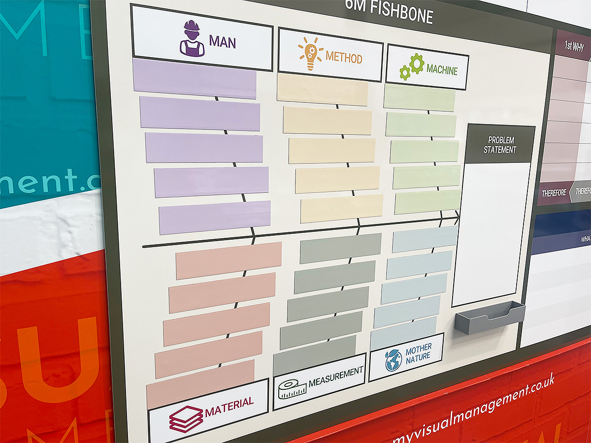 Problem Solving Board with Fishbone and root cause analysis